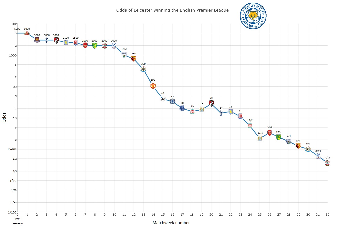 The implied probability of Leicester winning the league (using the above mentioned odds) also makes for interesting reading.