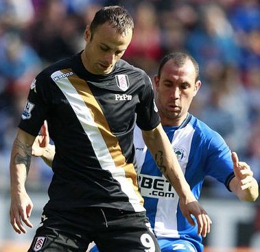 Manufactured by Kappa and sporting the sponsors logo in a different place compared to their home and away tops, the third kit saw Martin Jol’s men run out 2-1 winners over Wigan, with Hugo Rodallega and Damien Duff. Rodallega’s strike partner Dimitar Berbatov is here seen wearing FFC’s new third jersey.