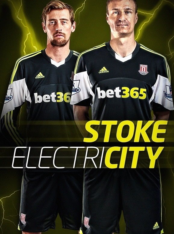 Stoke City have released their new away kit for 2013-2014, dubbed “Electricity” by the Potters. The predominantly black ( note the two different tones of black) top, we feel, looks ruined by the white bits on the side. This new SCFC kit is sponsored by Bet 365. Judging by the looks of Peter Crouch and Robert Huth in this promo pic, the two players don’t look too enthused by the strip either