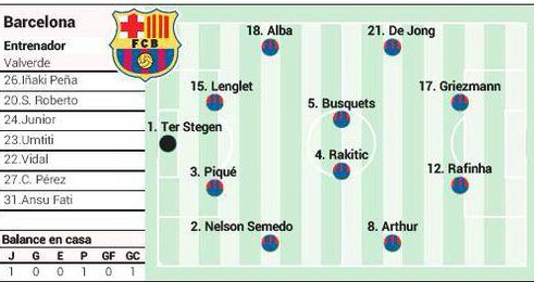 With the trio of Messi, Suarez and Dembele all in the treatment room, Valverde will have to shuffle his troops. One option is to go for a 4-4-2 and ask Rafinha to play alongside Antoine Greizmann, while another could see youngster Carles Perez get a start, given that both Malcom and Philippe Coutinho have left the club this summer.