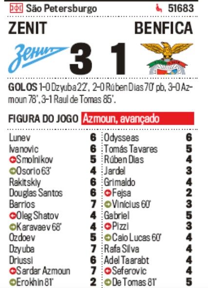 Correio da Manha Portuguese newspaper player ratings Zenit vs SLB 2019
