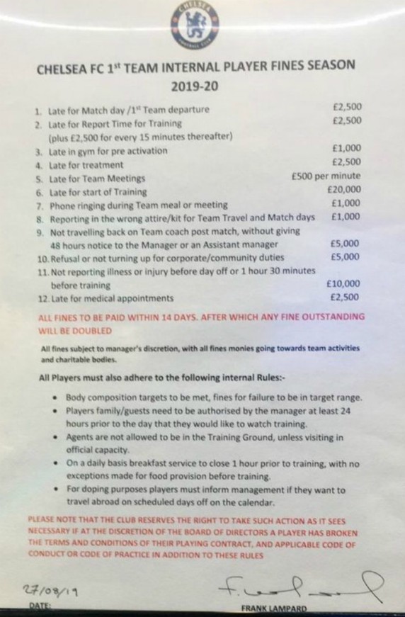 Ever wondered what a club’s internal disciplinary system looks like? This one from Chelsea, circulating on social media, gives an idea of the fines the club’s players pay.