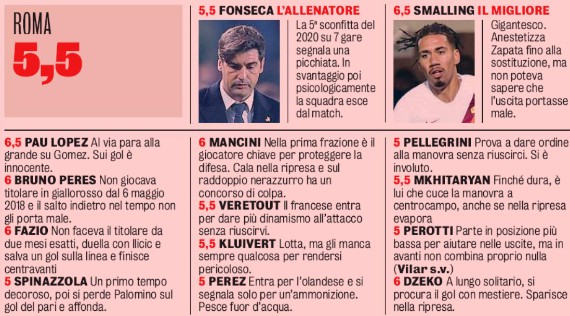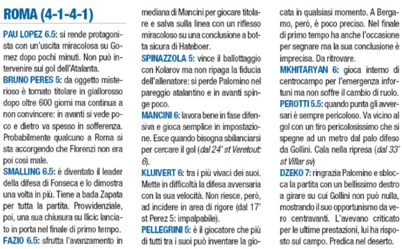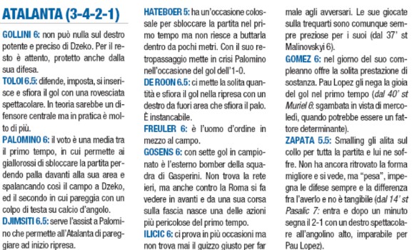 Gazzetta dello Sport player ratings Atalanta-Roma 2-1