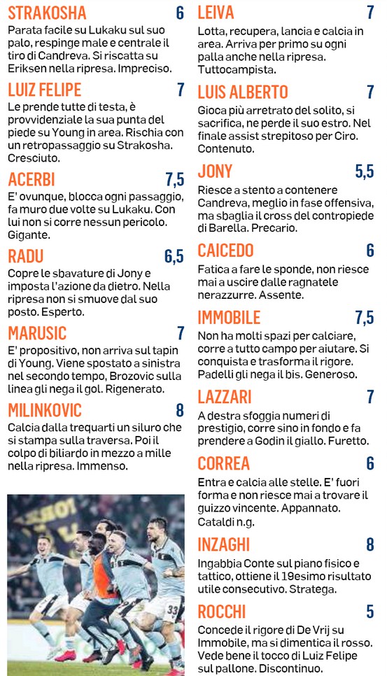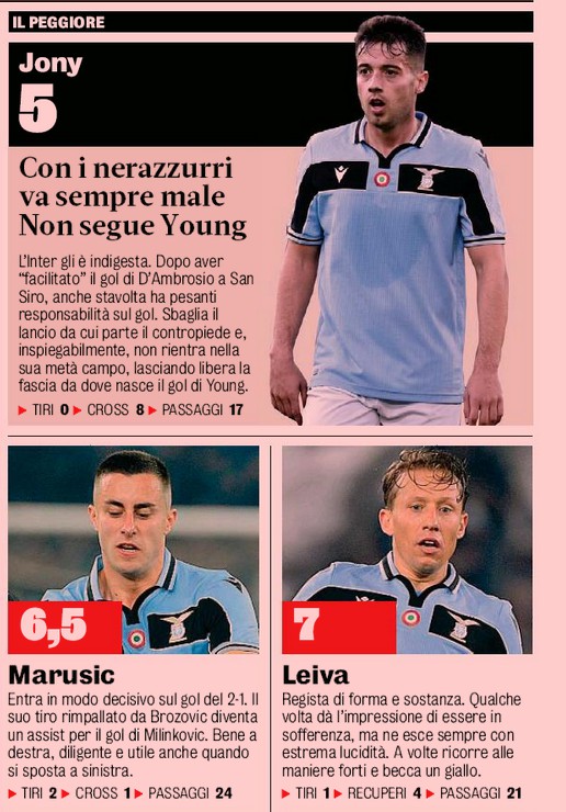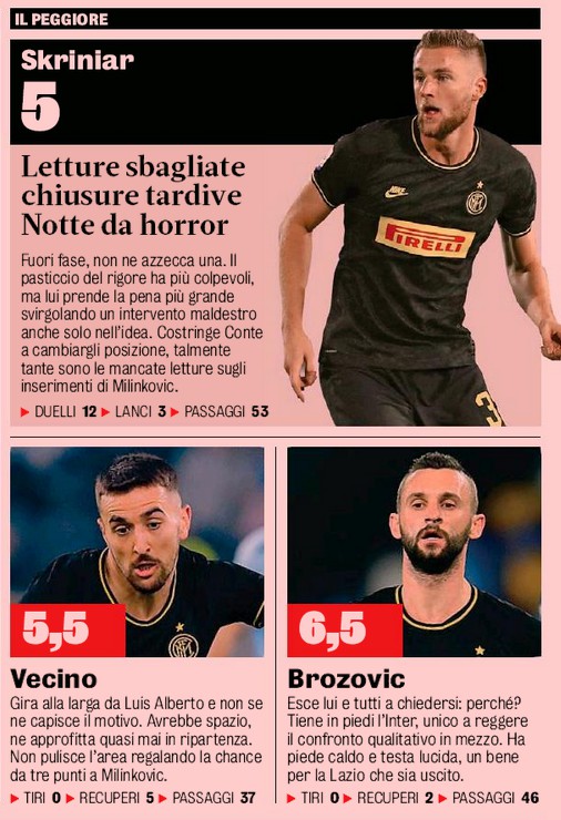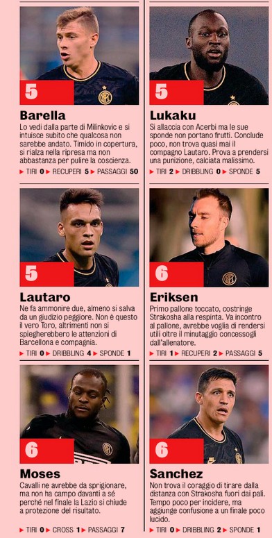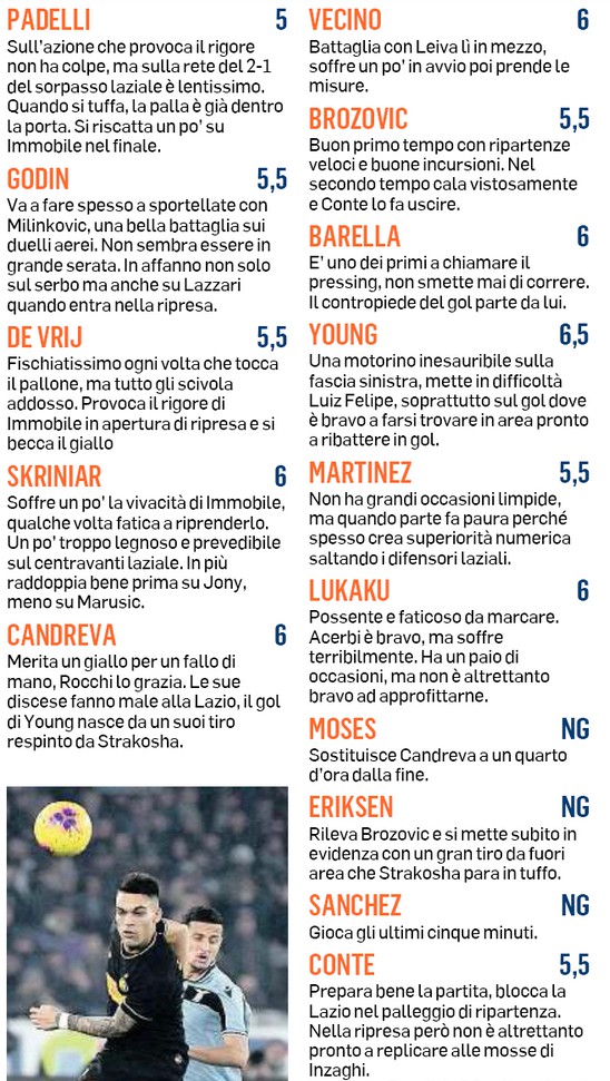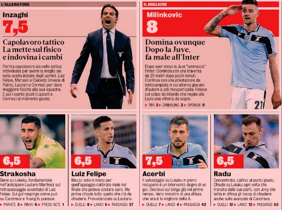 Gazzetta dello Sport player ratings Lazio-Inter 2-1