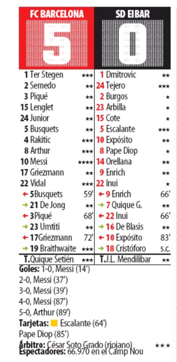 Here is how the big Spanish newspapers rated Barcelona and Eibar’s players following the former’s 5-0 win at the Nou Camp. Lionel Messi, with his four goals, was the star of the show, while Martin Braithwaite, making his Barca debut, also made an impact while coming off the bench.