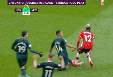This Djenepo red card v Newcastle saw the Saints midfielder sent off for this challenge on Magpies star Isaac Hayden. The Djenepo tackle on Hayden was initially only deemed worthy of a yellow card, but a VAR review saw it upgraded to a red card by referee Graham Scott