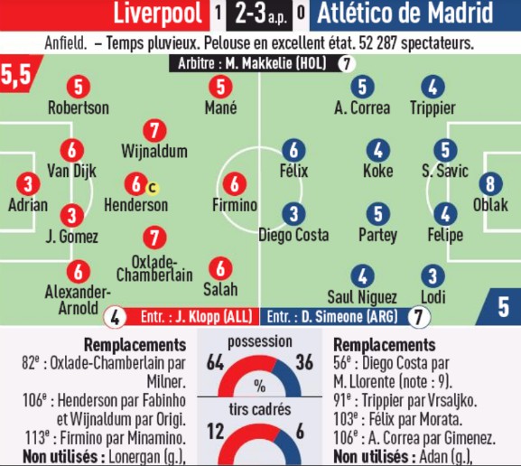 French publication L’Equipe thought Adrian and Joe Gomez both had terrible evenings, giving them a 3/10 rating. The game changer was Marcos Llorente- he got a 9/10 from the bench, and the player he replaced, Diego Costa, was a 3/10.