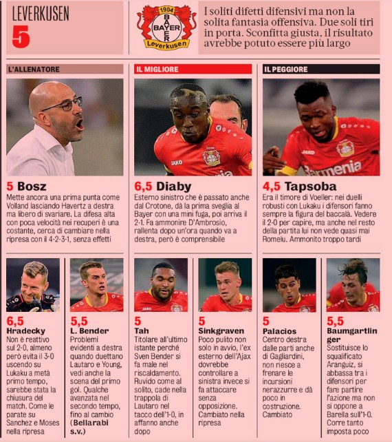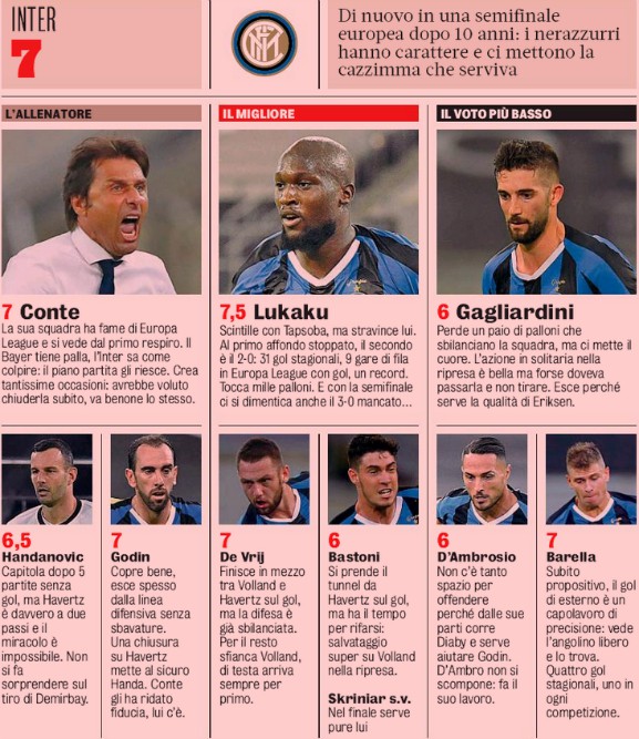 Gazzetta gave Internazionale and coach Antonio Conte a rating of 7/10, with Leverkusen given a 5/10.