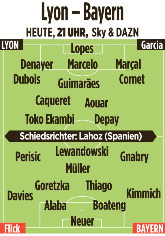 Here is a look at the predicted starting lineups for Bayern Munich vs Lyon from the big French and German newspapers. The referee for this Champions League semifinal will be Mateu Lahoz from Spain.
