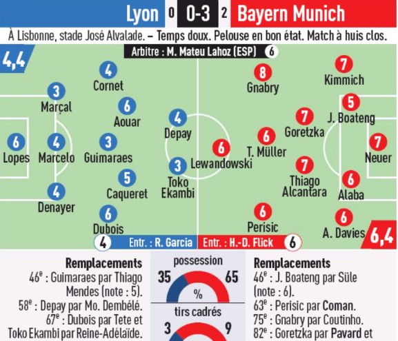 Here are the player ratings from Lyon vs Bayern from the big German and French newspapers following their Champions League semi-final on 19 August, 2020. Bayern won 3-0, thus advancing to a final against Paris Saint-Germain.