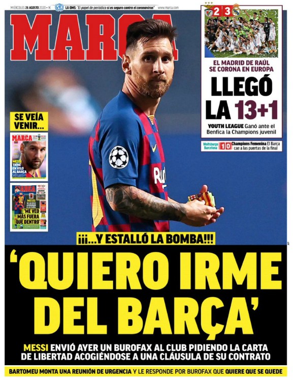 Here is how some of the big Spanish sports newspapers (Sport, Marca, AS, MD and L’Esportiu) reacted to the news of Lionel Messi wanting to leave Barca. Frontpage headlines for August 26, 2020 (Wednesday)