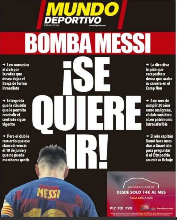 Mundo Deportivo (Bomba Messi- “Messi Bomb, He wants to Leave”)