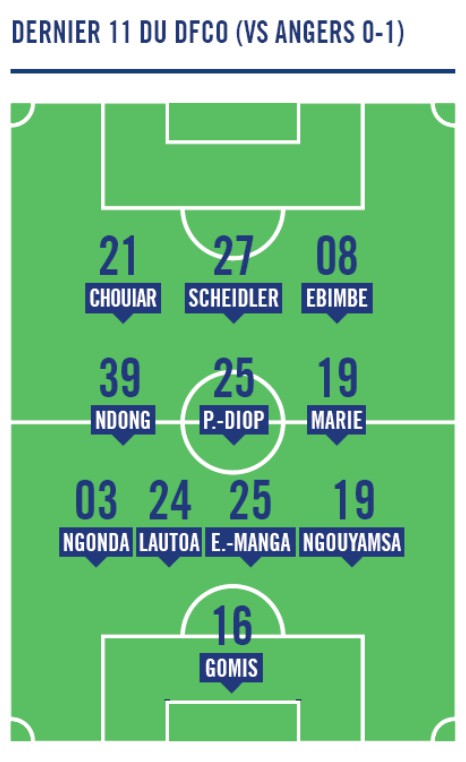 This is DFCO’s last starting XI (v Angers), and L’Equipe, as you can see, think there will be quite a few changes. A couple are in defence, where Ngonda at left back is injured, and they have Chala to replace him. On the right side, Ahmad Ngouyamsa is expected to make way for Fouad Chafik. Pape Cheikh Diop started for DFCO against Angers, but as he is on loan from Lyon, he will not play this fixture as per a clause in his loan contract.