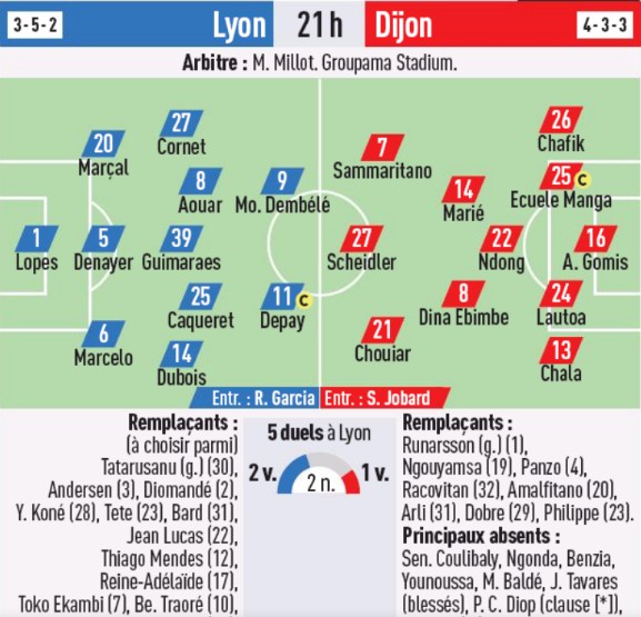 Lyon: Lopes, Marcal, Marcelo, Denayer, Cornet, Caqueret, Bruno, Dubois, Memphis, Toko Ekambi, Dembele