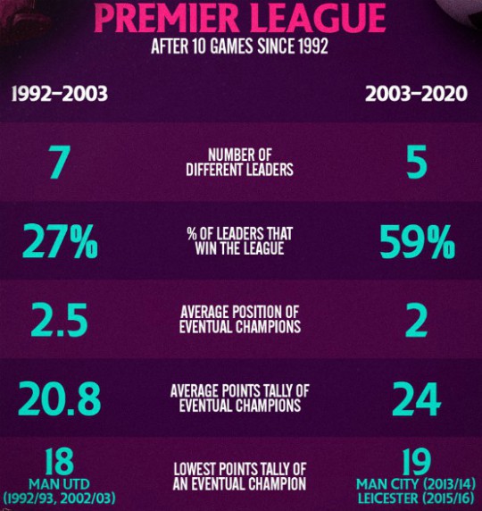 Research appears to show that the most recent winners of the league have generally been quick off the blocks. In 2017/18 and 2018/19, Manchester City (champions on both occasions) had 28 and 26 points respectively to their name after 10 rounds. Liverpool’s 19/20 campaign had them at 28 as well.