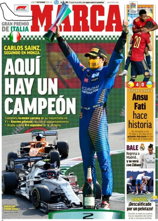 Marca didn’t run it as their main headline- they preferred to focus on Carlos Sainz’s finish at Monza. However it was present on the side as “Hace Historia” (Ansu makes history)