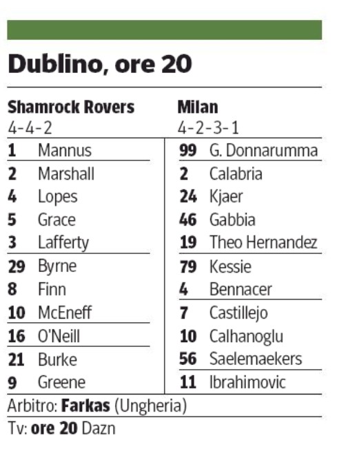 Corriere della Sera paper probable lineups Shamrock Rovers AC Milan