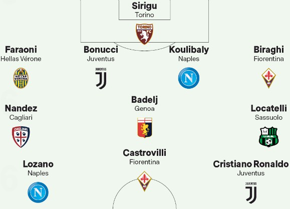 All seven games produced goals, with the highest scoring game being Genoa’s 4-1 win over Crotone. Napoli were the only away team to register a win (2-0 away at Parma), and have two representatives in this TOTW (Koulibaly and Lozano). The other teams were two representatives are Juve (Ronaldo, Bonucci) and Fiorentina (Biraghi, Castrovilli). The only player in the Team of the Week from a losing side is Torino goalkeeper Salvatore Sirigu.