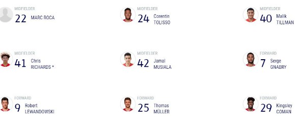 Midfielders: Joshua Kimmich, Javi Martinez, Leroy Sane, Douglas Costa, Eric Choupo-Moting, Leon Goretzka, Alphonso Davies, Marc Roca, Corentin Tolisso, Malik Tillman, Jamal Musiala (11)
