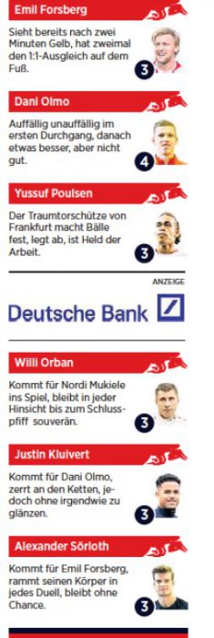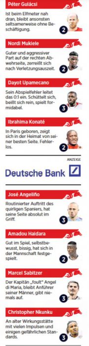 RB Leipzig player ratings vs PSG from Leipziger Volkszeitung paper (6 very bad, 1 very good)
