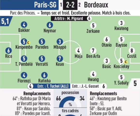 Paris Saint-Germain player ratings vs Bordeaux 2020 Le Parisien paper