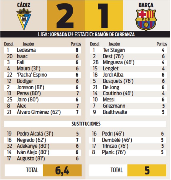 Here is a look at the player ratings for Cadiz vs Barca from the big Spanish newspapers following the latter’s shock 2-1 loss on 5 December, 2020.