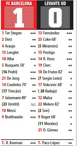 Here is a look at the player ratings for Barcelona vs Levante on December 13, 2020 from the big Spanish newspapers. Barca edged the clash 1-0 thanks to Lionel Messi’s second half strike.