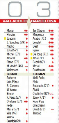 A 7.4/10 team rating for Barca as opposed to the 5/10 for Valladolid from Diario Sport. Messi and Pedri the standout players in their eyes, with both getting a player rating of 9/10.