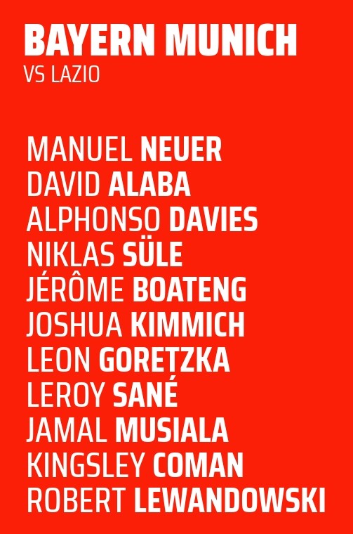 Bayern: Neuer, Alaba, Davies, Boateng, Sule, Kimmich, Goretzka, Sane, Musiala, Coman, Lewandowski