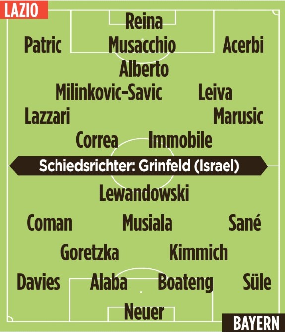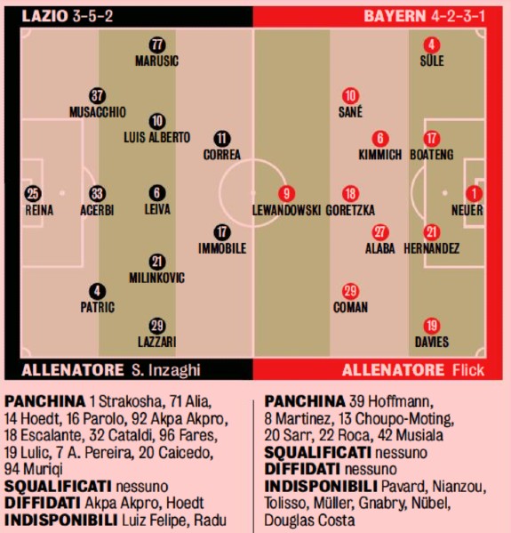Possible XI Lazio-Bayern Munchen from Gazzetta dello Sport