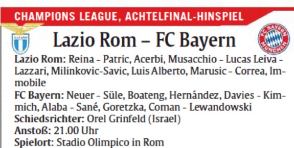 Abendzeitung Munchen newspaper probable lineups for Lazio FCB UCL Round of 16