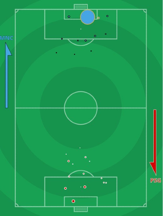 xG Man City 1.39-0.89 PSG shots map (Actual score MCFC 2-0 Paris SG)