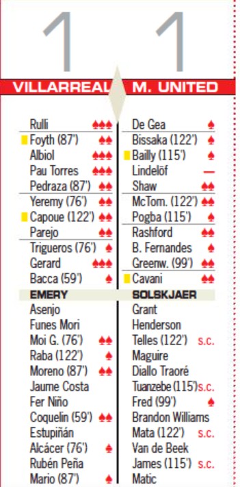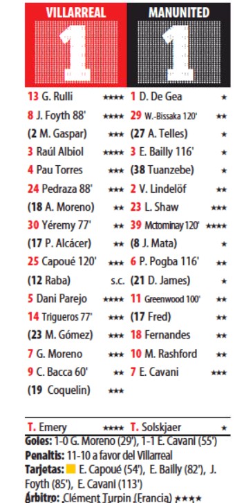 Here is a look at how the big Spanish and European newspapers gave their player ratings for the 2021 UEL final between Villarreal and Man Utd. Villarreal, coached by former Arsenal boss Unai Emery, prevailed on penalties after the game had ended 1-1.