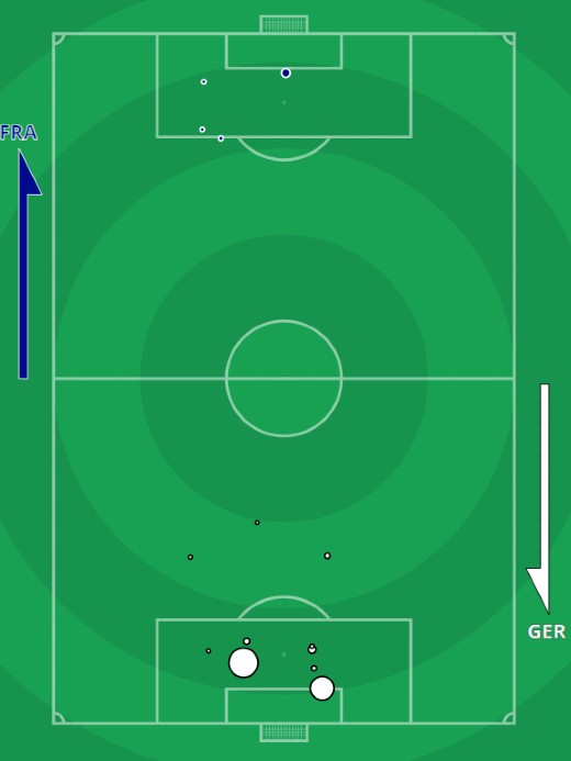 xG France 0.31-1.32 Germany shots map (Actual score France 1-0 Germany)