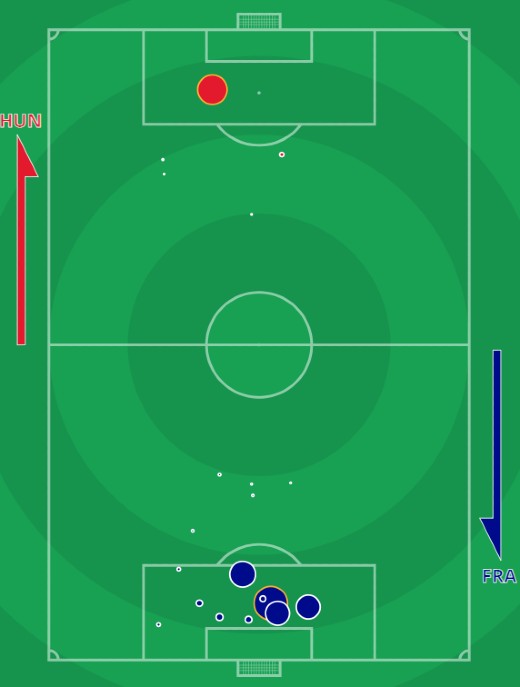 xG Hungary 0.61-2.37 France shots map (Actual score Hungary 1-1 France)
