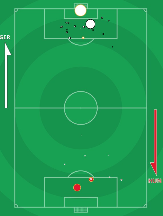 xG Germany 2.03-0.85 Hungary shots map (Actual score Germany 2-2 Hungary)