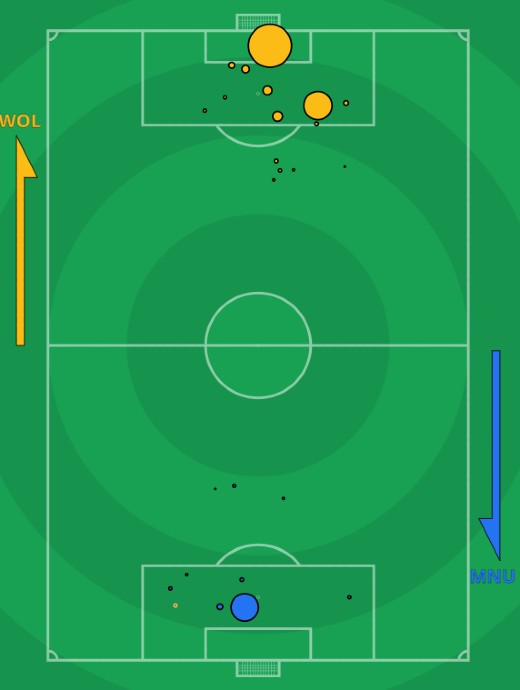 xG Wolves 2.06-0.85 Man United shots map (Actual score Wolverhampton 0-1 MU)