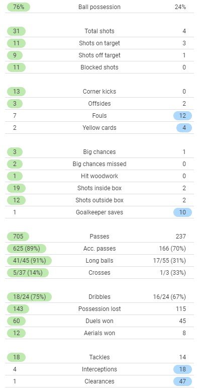 31 shots for Real Madrid to 4 for Sheriff and 76 % possession for RMA