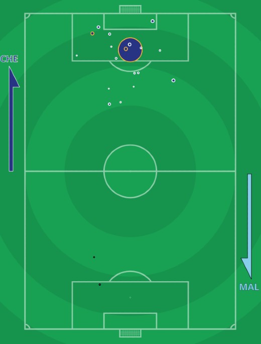 xG Chelsea 2.63-0.07 Malmo FF shots map (Actual score CFC 4-0 MFF)