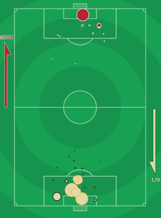 xG Man United 1.31-3.73 Liverpool shots map (Actual score MU 0-5 LFC)