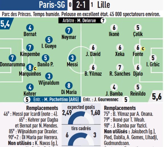 Marquinhos and Di Maria the best of the Paris SG players according to L’Equipe- both got a 8/10. PSG as a team were given a 5.4/10 rating, with Lille a 5.6/10. Renato Sanches the pick of the LOSC players.