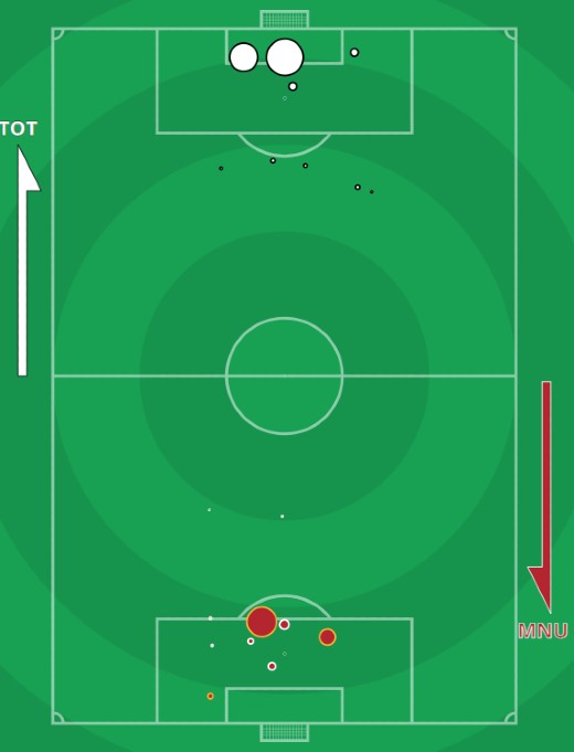 xG Spurs 1.38-1.12 Man U shots map (Actual score Spurs 0-3 MUFC)