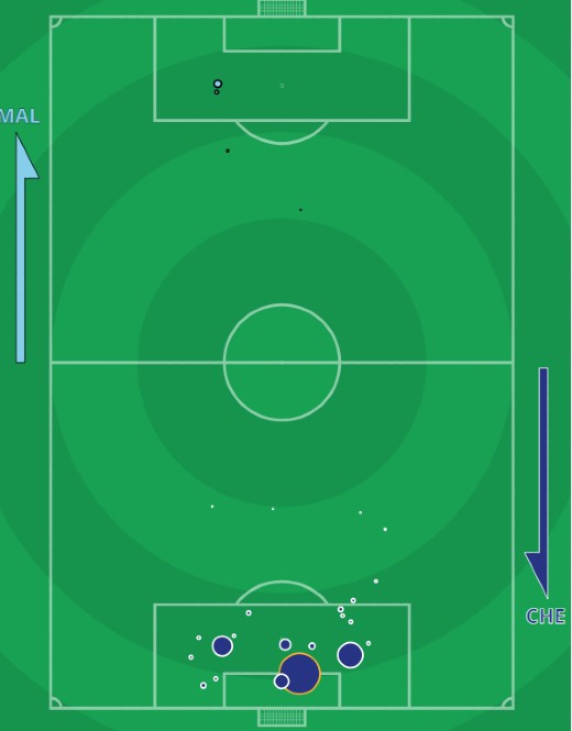 xG Malmo 0.20-2.63 Chelsea shots map (Actual score MFF 0-1 CFC)