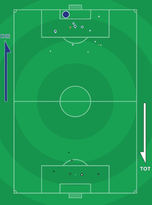 xG Chelsea 1.22-0.35 Spurs shots map (Actual score CFC 2-0 THFC)