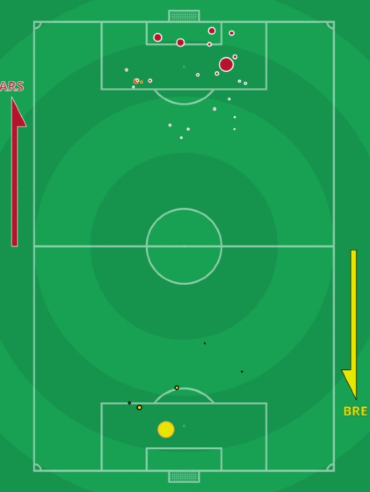 xG Arsenal 1.87-0.61 Brentford shots map (Actual score AFC 2-1 Brentford)