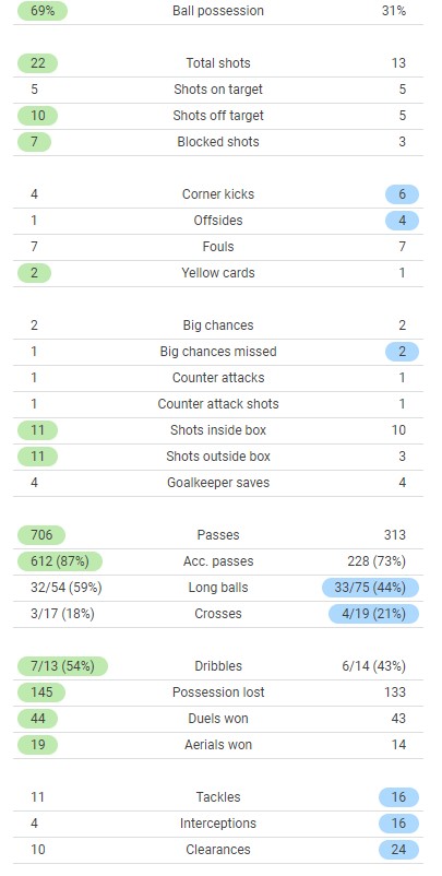 LFC 1-0 WHUFC Match stats (Liverpool stats on left; WHUFC on right)