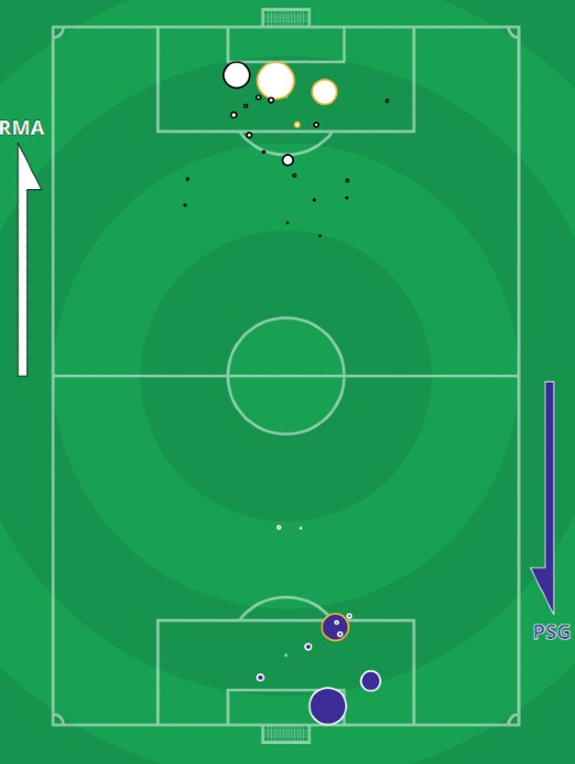 xG Real Madrid 2.09-1.51 PSG shots map (Actual score RMA 3-1 Paris SG)