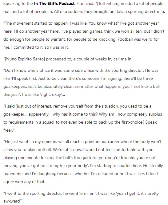 Joe Hart left Tottenham Hotspur for Celtic earlier this 21/22 season, and the former England No.1 has now revealed what exactly that coach Nuno Espirito Santo said that made him switch.