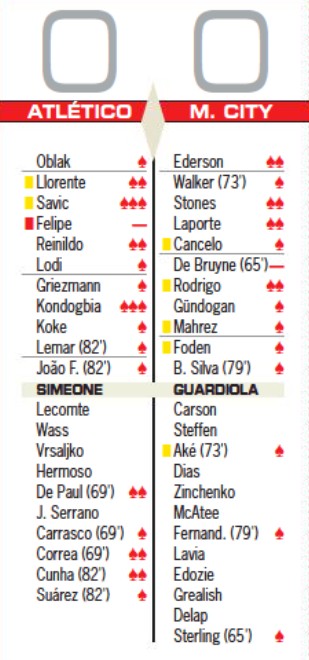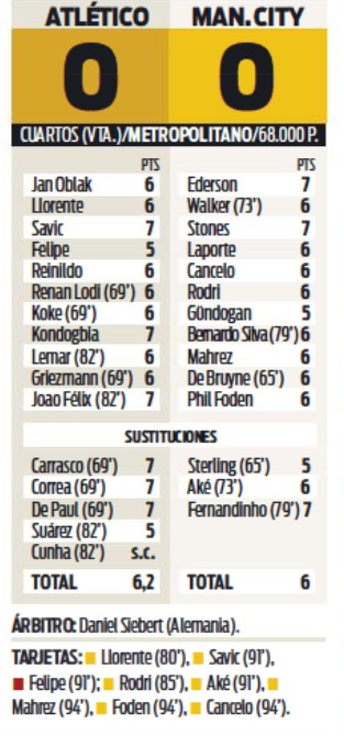 Here is a look at the player ratings for Atleti v Man City (Second Leg UCL QF 13 April, 2022) from the big European sports newspapers. A 0-0 draw, although City shaded it on xG