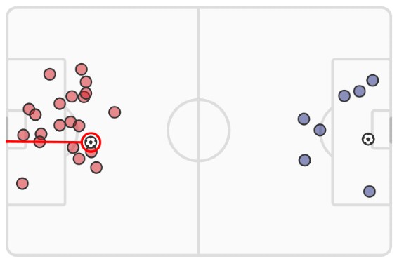 42nd minute Hojbjerg shot vs Liverpool xG 0.02 (hits post)